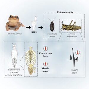 Graphical Abstract created for a scientific article Publisher in Journal of Insect Physiology. The illustration represents the mechanism of action of RIPS/RITS (Rhinella icterica parotoid/toad secretion) on the musculature of insects (Nauphoeta cinerea and Locusta migratoria).